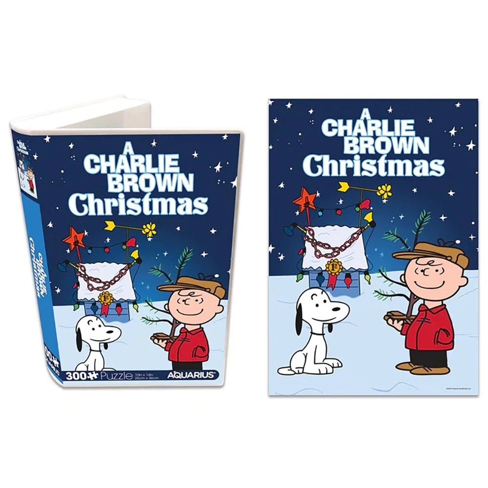 The golden age of video rentals is back with this retro jigsaw puzzle in a high-quality, plastic case inspired and designed after vintage VHS cases. This 300 piece puzzle features the A Charlie Brown Christmas logo with Snoopy and his decorated tree house, and Charlie with his Christmas tree.