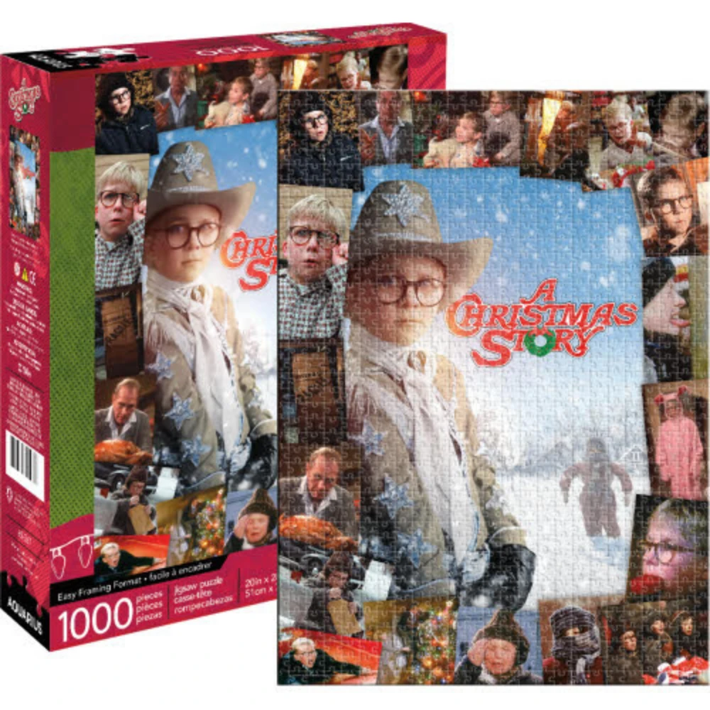 Reminisce about all of your favourite moments from A Christmas Story with this 1000 piece jigsaw puzzle that depicts some classic scenes from the film. The main image is Ralphie in his cowboy costume defending the Parker family from Black Bart, surrounded by images from the funniest and most heartfelt moments in A Christmas Story