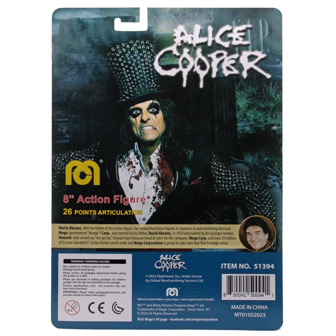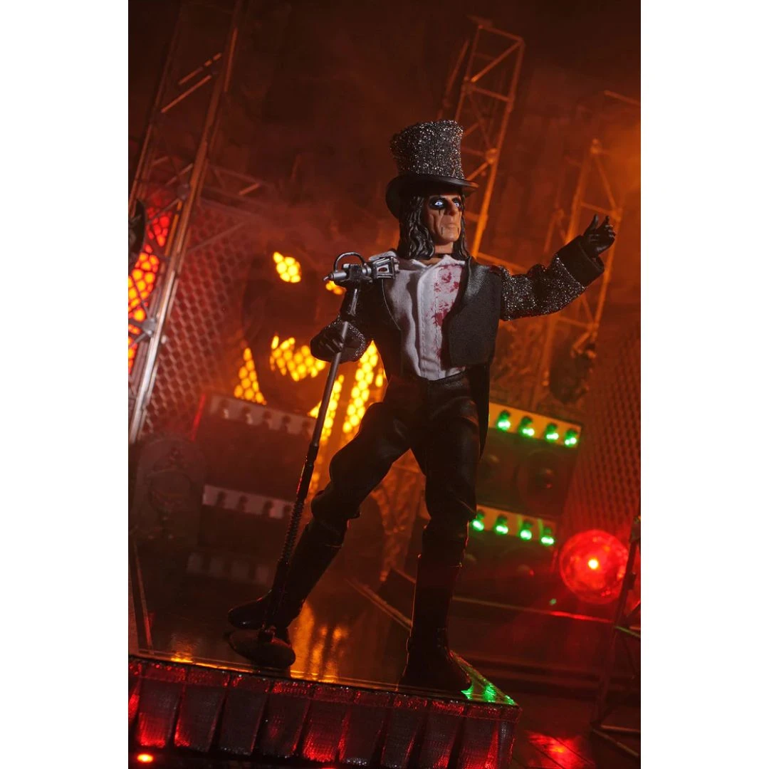 This excellent recreation of the iconic rocker Alice Cooper features him wearing a real fabric replication of his signature Welcome to My Nightmare look, with blood stained shirt, and top hat. Alice Cooper stands at 8 inches in height and comes with 26 points of articulation.
