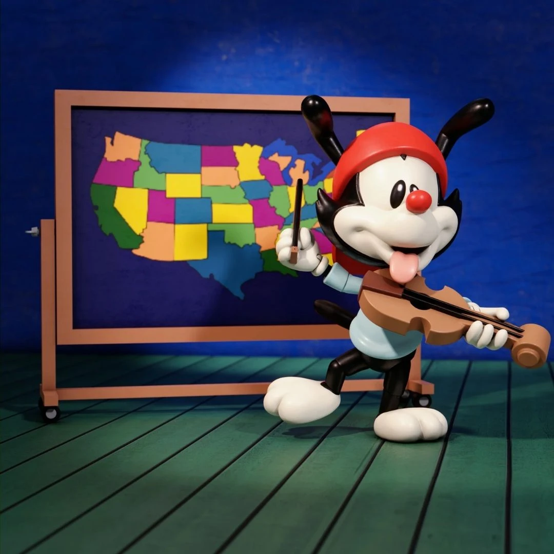 - Includes 2 interchangeable heads, 1 Tongue-out head, 1 Roman Empire helmet head, 9 interchangeable hands, 2 Neutral hands, 2 Opening show hands, 2 Playing violin hands, 1 Mallet gripping hand, 1 Dynamite gripping hand, 1 Pointing finger hand, 2 interchangeable tails, Neutral tail, Crooked tail, 1 Blackboard U.S. map, 1 Violin, 1 Mallet, and 1 Stick of dynamite