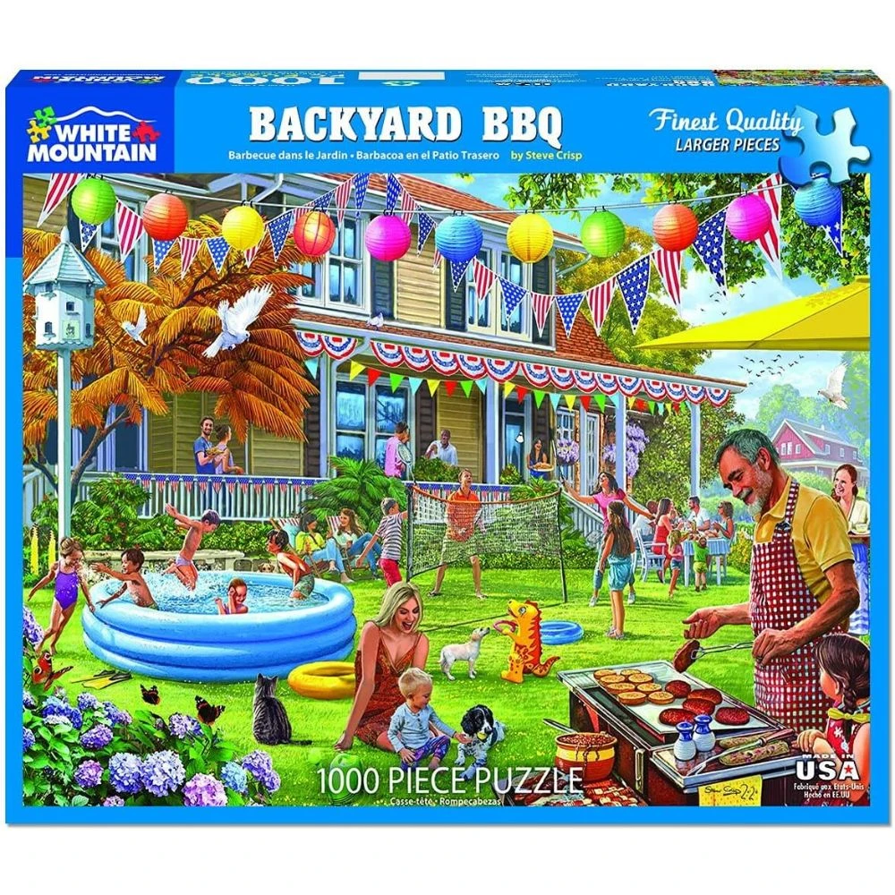 The Backyard BBQ 1000pc Jigsaw Puzzle by White Mountain is a delightful puzzle that captures the essence of a lively summer gathering. The puzzle features a vibrant and detailed image by artist Steve Crisp, depicting a multi-generational family and friends enjoying a backyard barbecue.