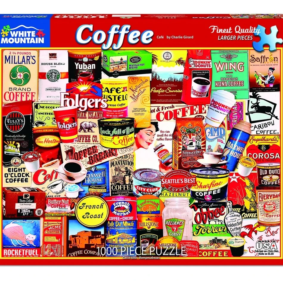 Brew yourself a cup of your favourite blend and sit down to enjoy this unique 1,000 piece puzzle. Includes a variety of vintage and modern brands.