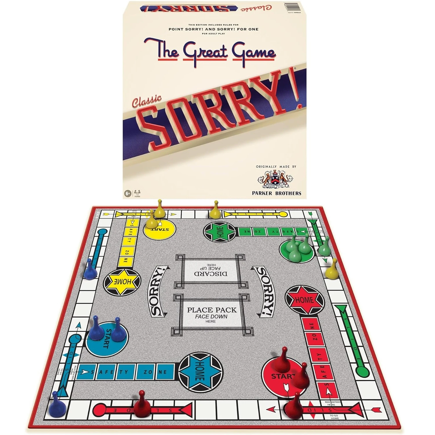 - Contents: Heavy-duty game board with original artwork, 16 iconic Sorry pawns, Deck of 44 cards and illustrated instructions