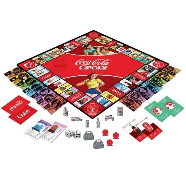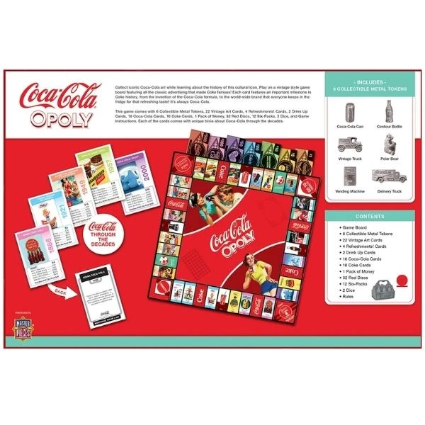 Collect iconic Coca-Cola art while learning about the history of this cultural icon. Play on a vintage style game board featuring all the classic advertising that made Coke famous! Each card features an important milestone in Coke history, from the invention of the Coca-Cola formula, to the world-wide brand that everyone keeps in the fridge for that refreshing taste! It’s always Coca-Cola. This game comes with 6 Collectible Metal Tokens, 22 Vintage Art Cards, 4 Refreshments! Cards, 2 Drink Up Cards, 16 Coca-Cola Cards, 16 Coke Cards, 1 Pack of Money, 32 Discs, 12 Six-Packs, 2 dice, and game instructions. Each of the cards comes with unique trivia.