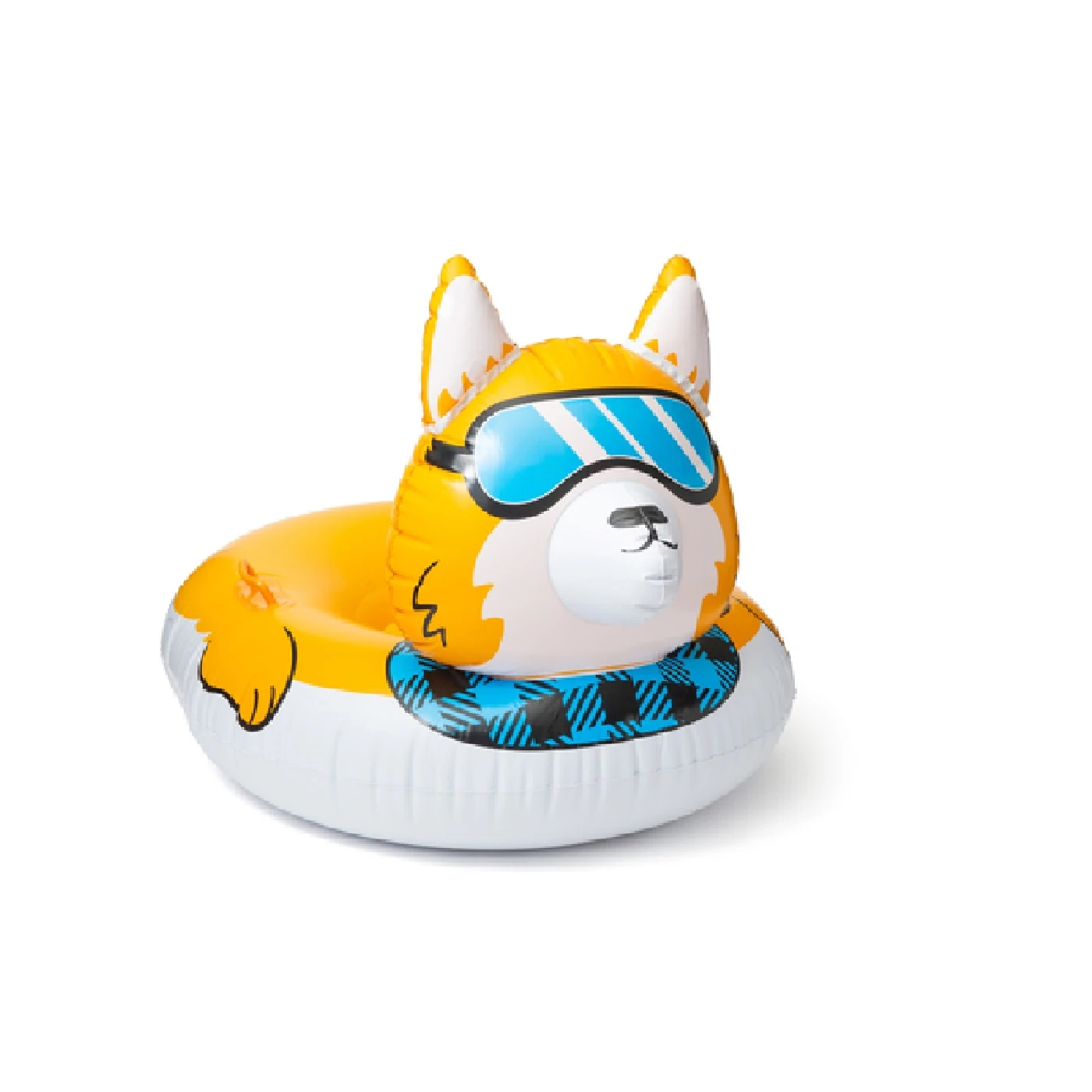 This cool Corgi Snow Tube is shaped like a Pembroke Corgi with ski goggles and a blue houndstooth scarf. This 4 foot wide snow tube provides a smooth, cushy ride down the hill.