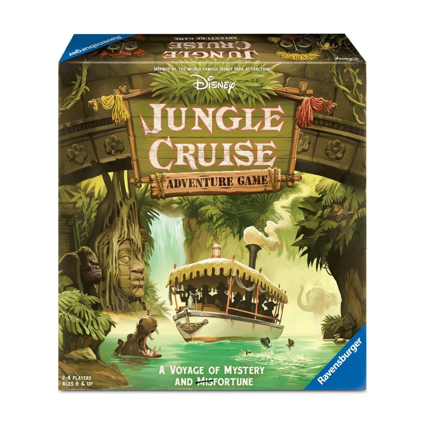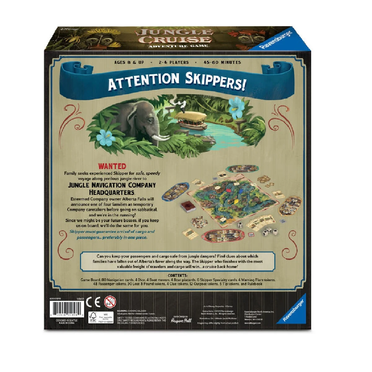 Disney’s Jungle Cruise Adventure Board Game by Ravensburger includes Game Board, Clock Tower, Card Tray, 4 Scene Boards, 4 Rotating Bases, 2 Boats, 2 Flag Sails, 2 Flag Tiles, 2 Card Holders, 100 Cards, Instructions.