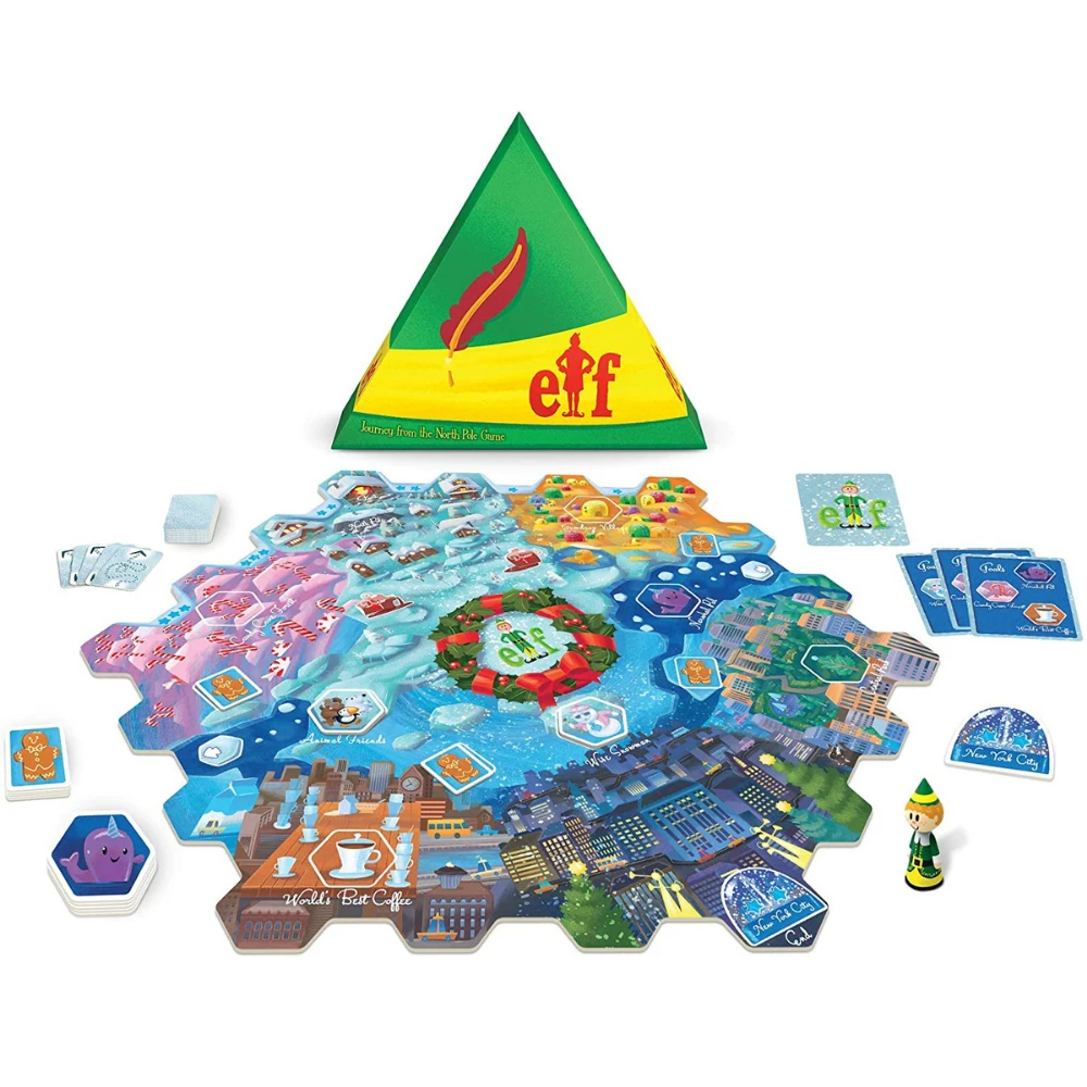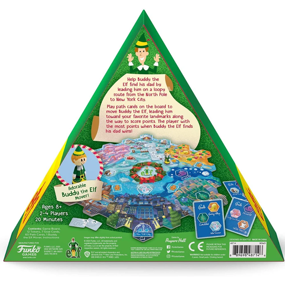 Help Buddy the Elf find his dad by laying a loopy route from the North Pole to New York City! Play path cards to the board and move Buddy along its crazy curves. Lead him toward your secret goal landmarks along the way to score points. The player with the most points when Buddy the Elf finds his dad wins!