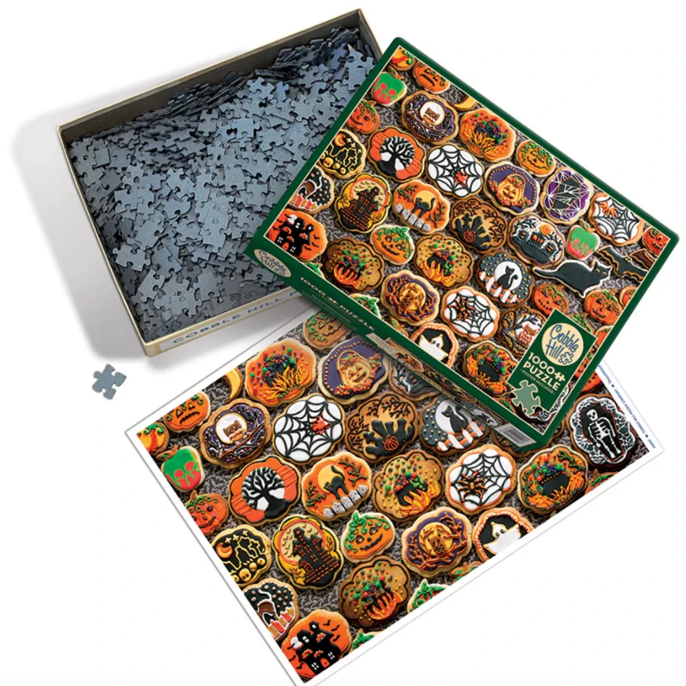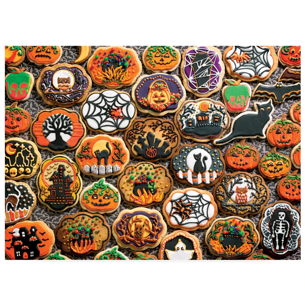 This Halloween Cookies puzzle is a fun way to celebrate the holiday without having to do all the baking. It’s a spooky feast for your eyes with cats, pumpkins, a witches cauldron, spider webs, haunted houses, and owls. A tasty treat without the tricks – and there is a matching poster included too!