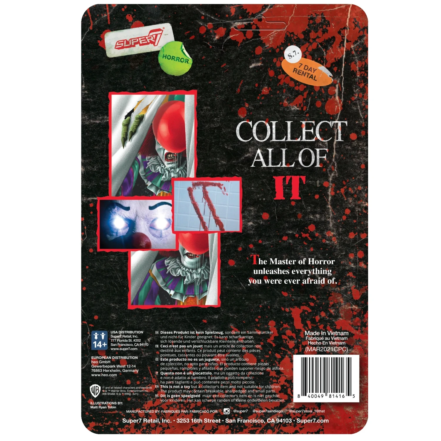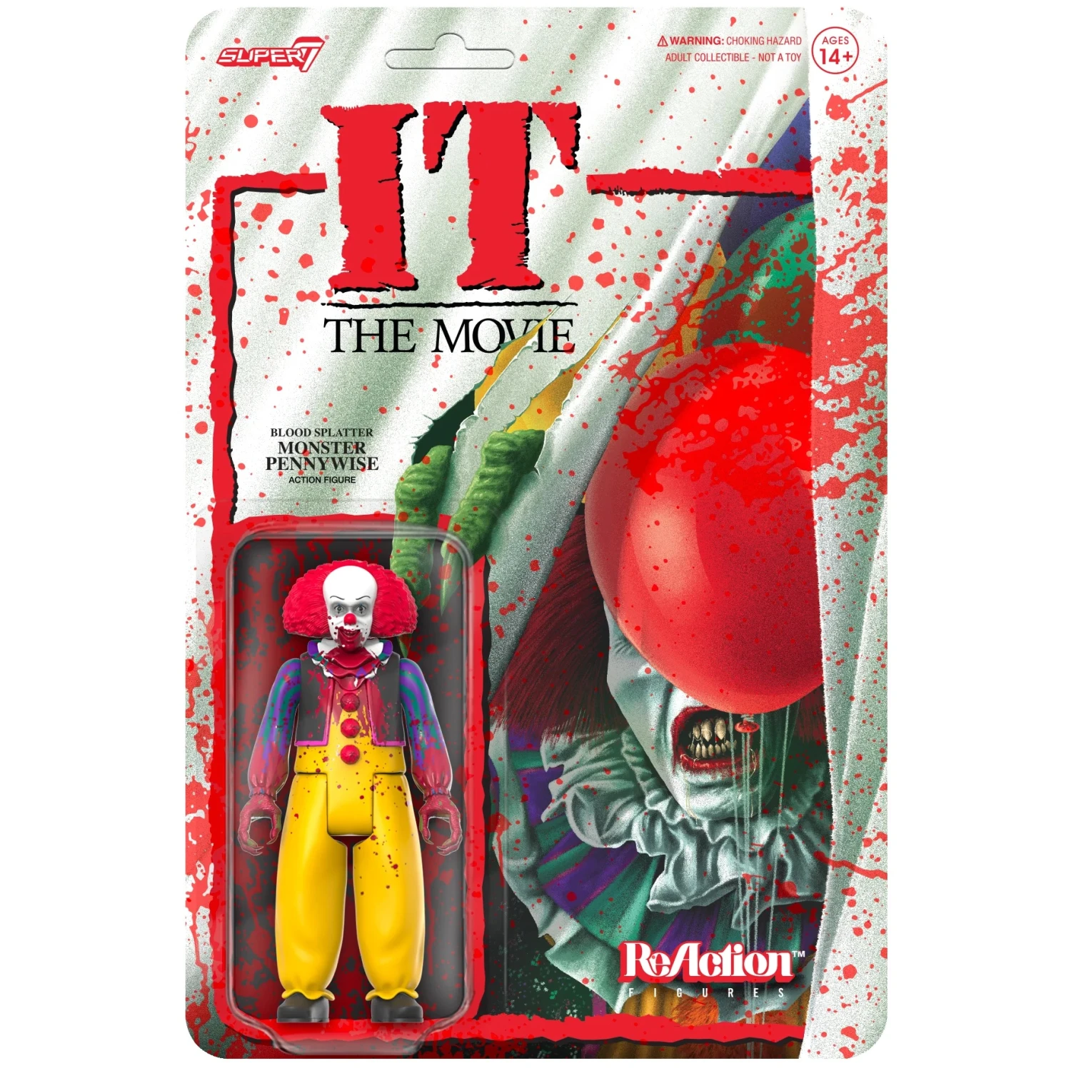 This 3.75” IT ReAction Figure of Monster Pennywise features a generous blood-splatter effect on both the figure and cardback. Inspired by the demonic clown’s appearance in the 1990 TV miniseries, the Blood-Splatter Monster Pennywise ReAction Figure would be a frightfully welcome addition to any horror collection!