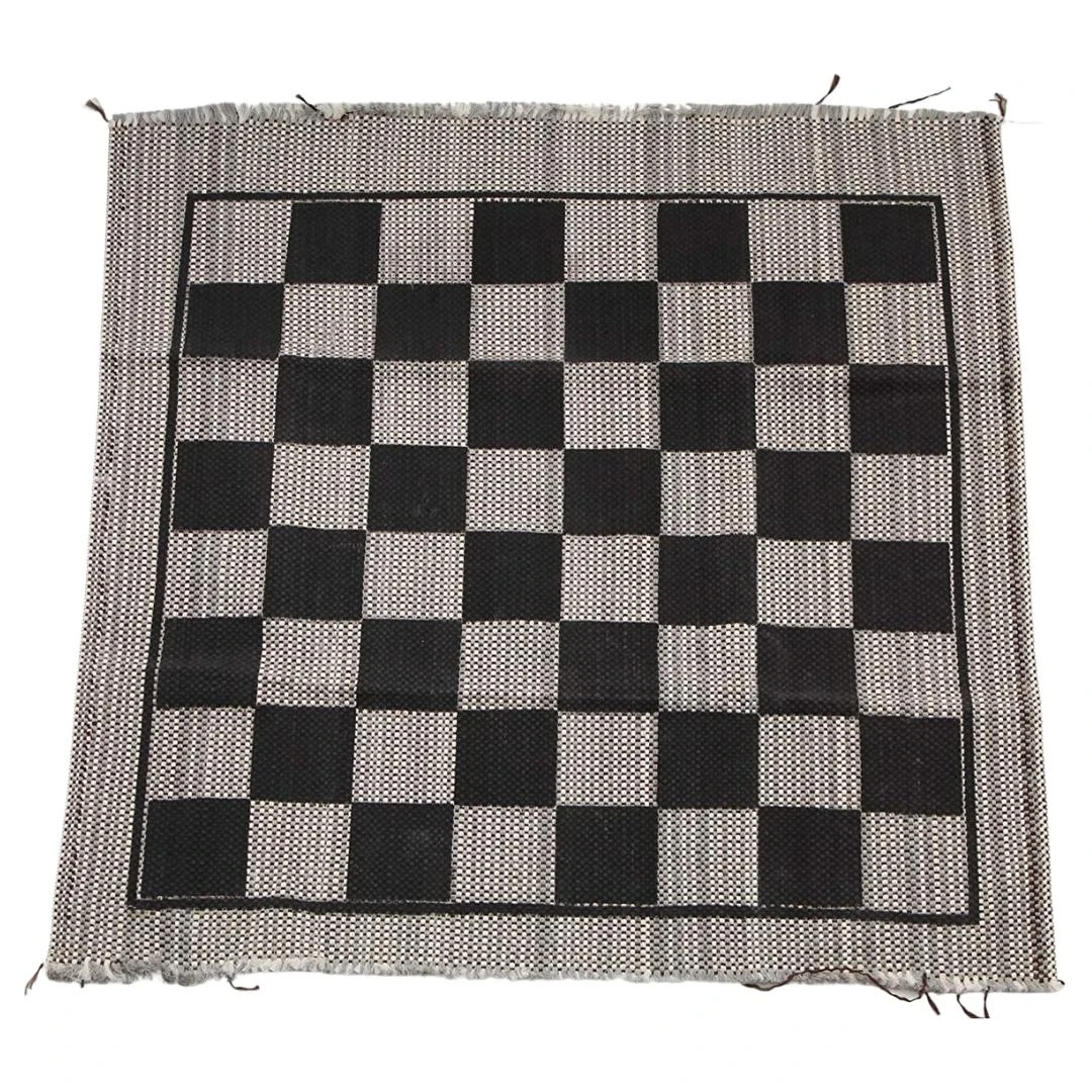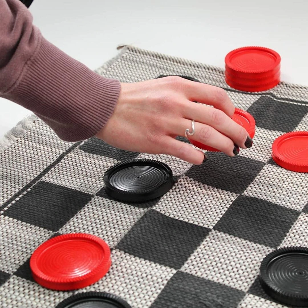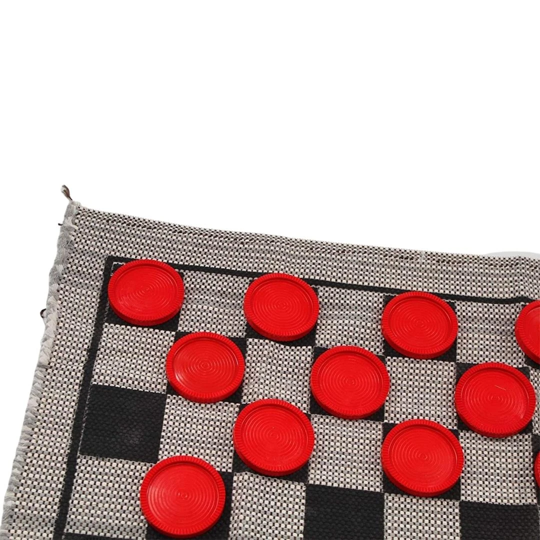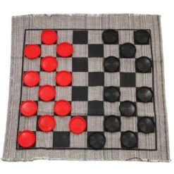 - Materials: Plastic checkers and synthetic and natural fibre rug
