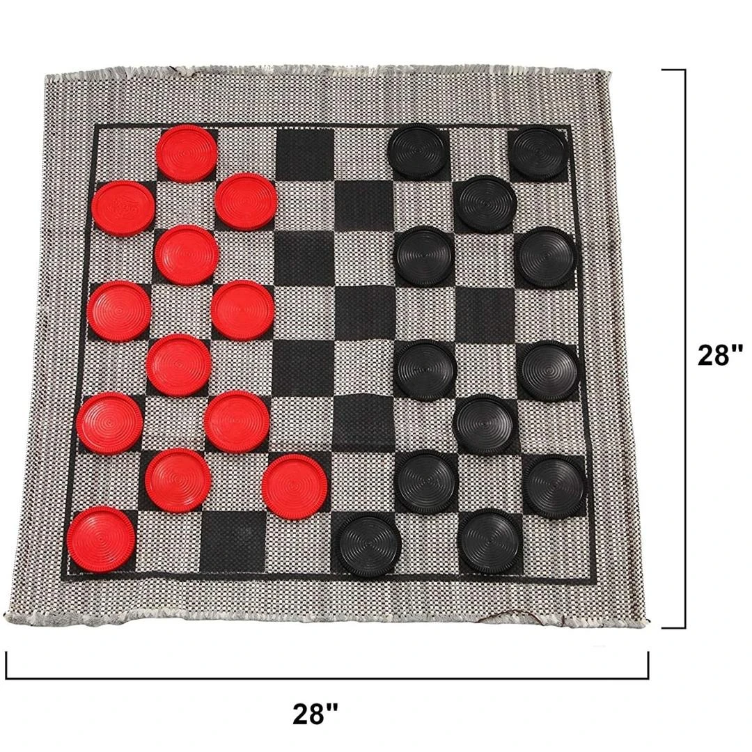 - Contents: 12 red checkers, 12 black checkers, machine washable rug, storage bag and instructions