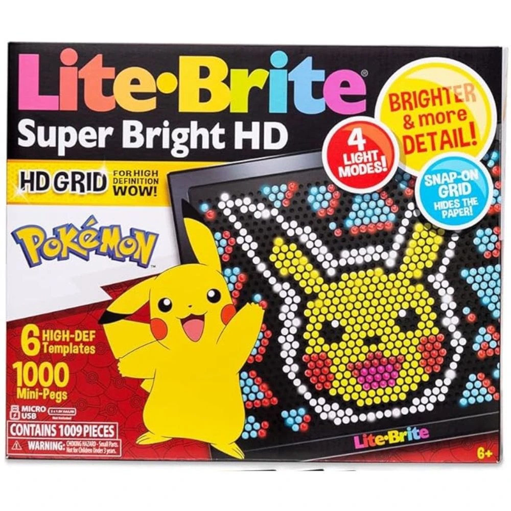 The Lite Brite Pokémon set features various templates of popular Pokémon characters. Using the classic Lite Brite setup, you can insert colorful pegs into the templates to create illuminated pictures of your favorite Pokémon.