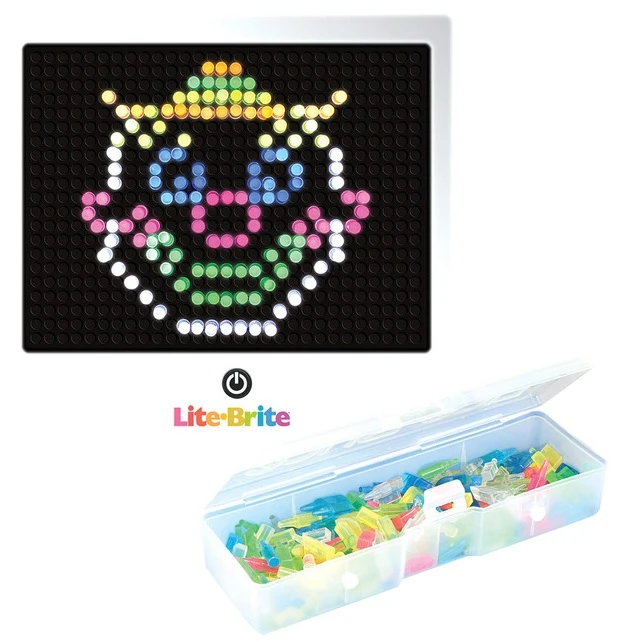 Its art with light! This timeless classic is back with more fun than ever! Includes a removable storage tray and a ton of different shaped pegs. Features 2 reusable templates! Requires 3 AA batteries, not included.
