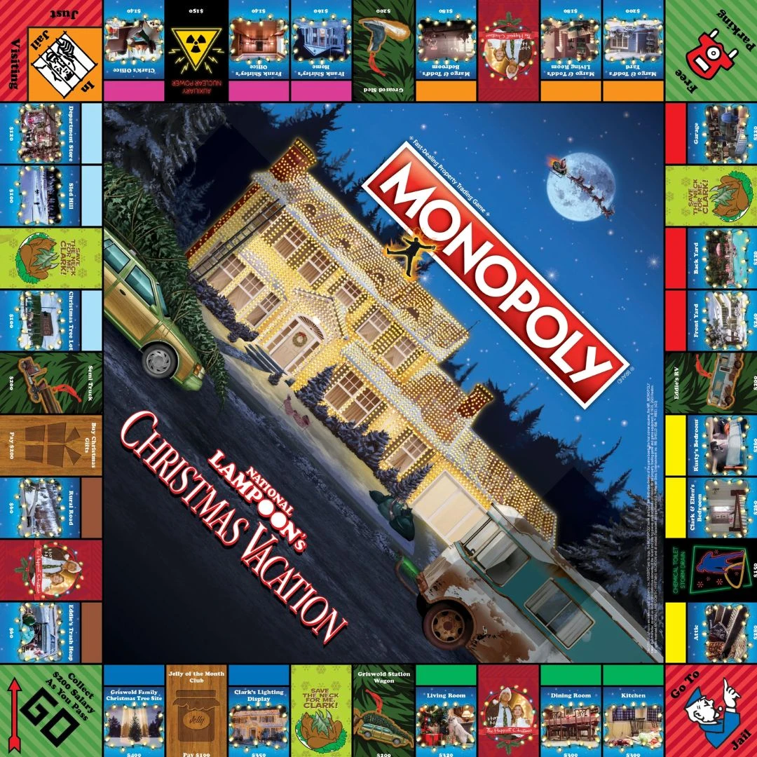 Relive the chaos of your favourite Christmas comedy with the ultimate game for fans of the Griswolds! MONOPOLY: National Lampoon’s Christmas Vacation lets players buy, sell, and trade locations from the hilarious holiday classic, such as Clark’s Lighting Display, Griswold Family Christmas Tree Site, and more. Travel the board with custom movie-inspired tokens including a dry turkey, chainsaw, or squirrel to set up Decorations and Christmas Spirit. Dodge costly Chemical Toilet Storm Drain and Jelly of the Month payments and be the last player with Griswold Bucks to win!