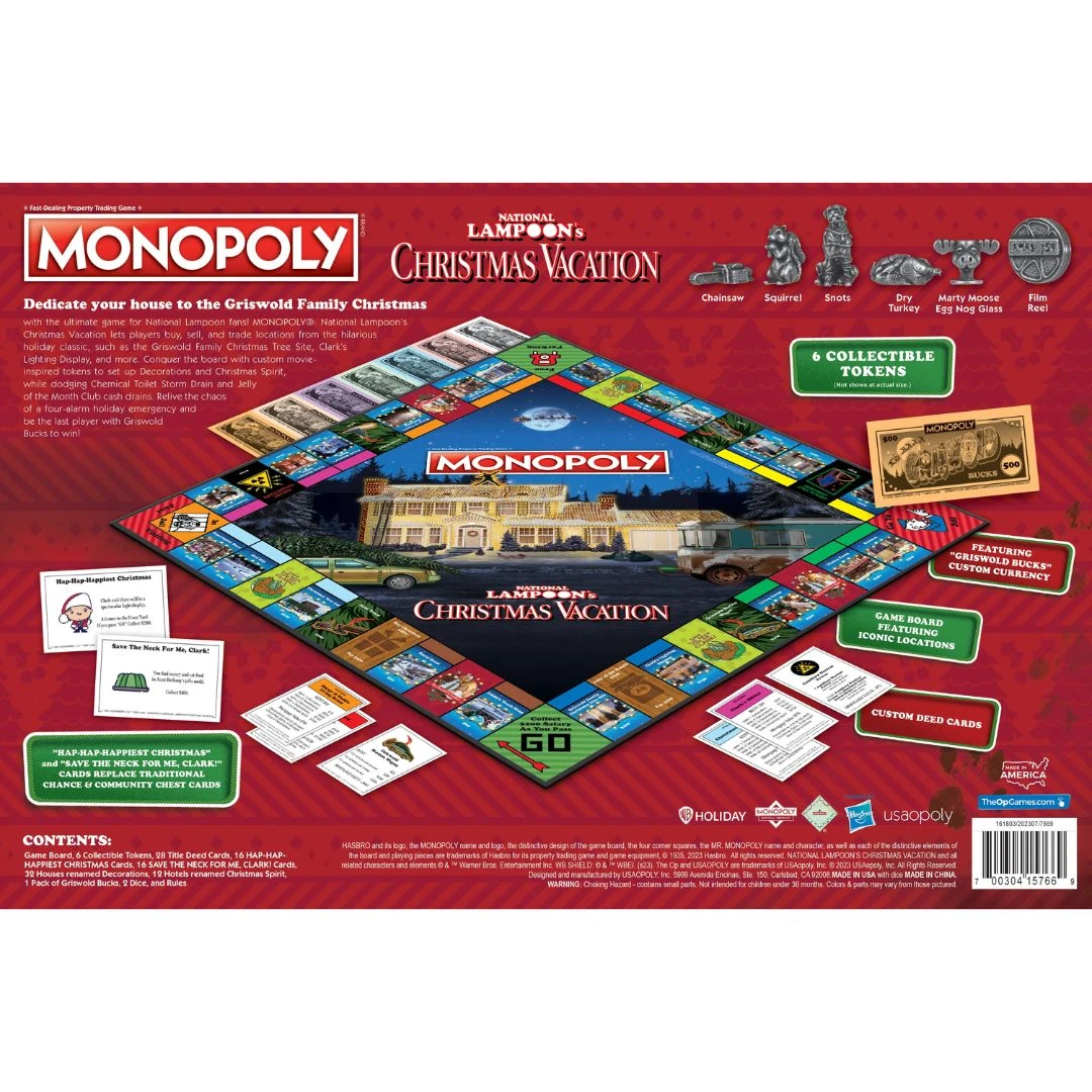 Monopoly Christmas Vacation includes: Game Board, 6 Collectible Tokens: Chainsaw, Squirrel, Snots, Dry Turkey, Marty Moose Eff Nog Flass, Film Reel, 28 Title Deed Cards, 16 Hap-Hap-Happiest Christmas Cards, 16 Save the Neck For Me, Clark! Cards, 32 Houses renamed Decorations, 12 Hotels renamed Christmas Spirit, 1 pack of Griswold Bucks, plus 2 Dice and Rules.