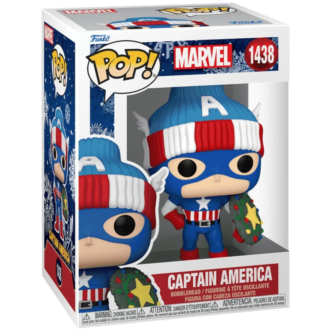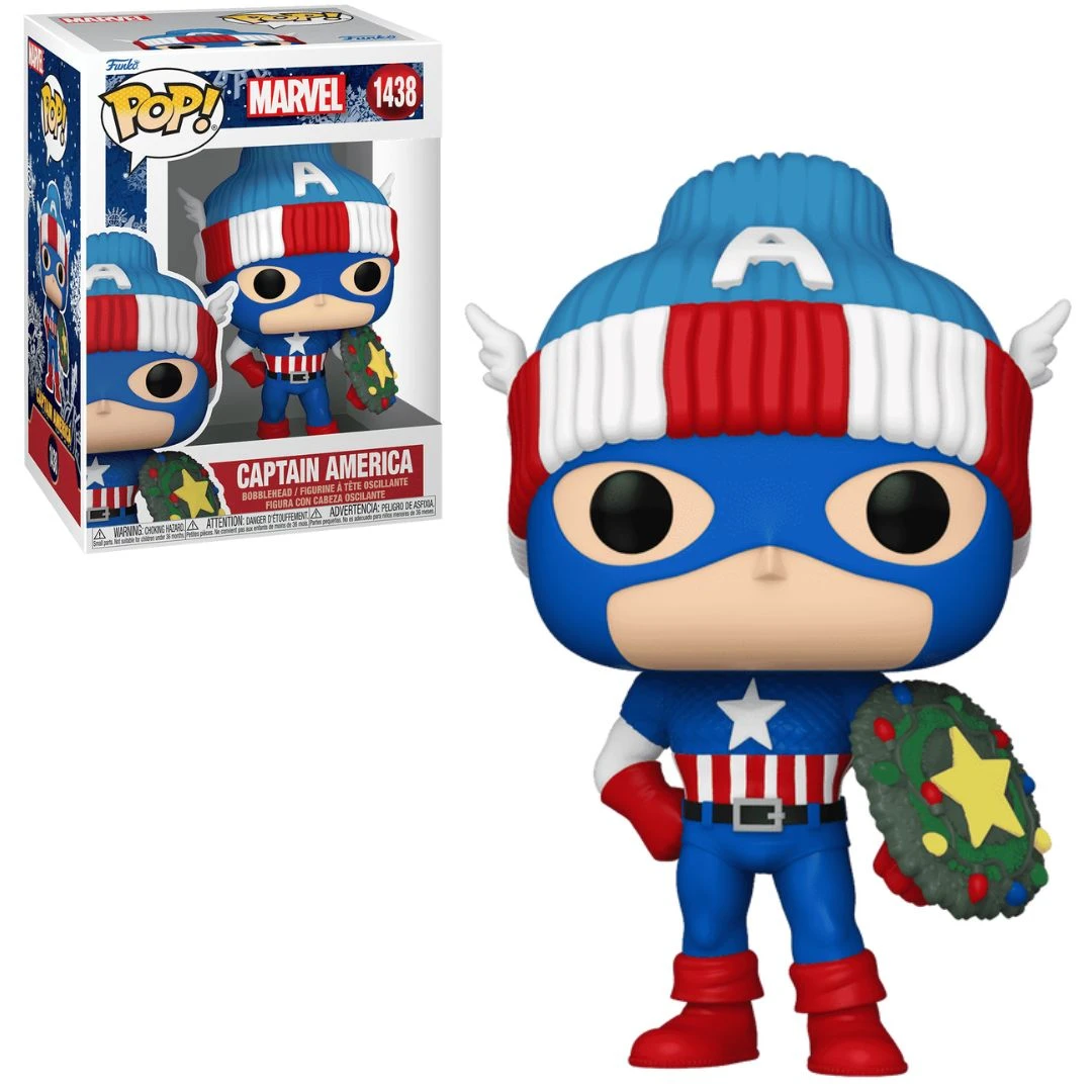 Bundle up for the holidays with Pop! Captain America Holiday! This super soldier has gotten into the spirit of the season by donning a cozy hat and decorating his shield with lights and evergreen boughs. Complete your Marvel collection with Pop! Captain America Holiday. Vinyl bobblehead is approximately 4.35-inches tall.