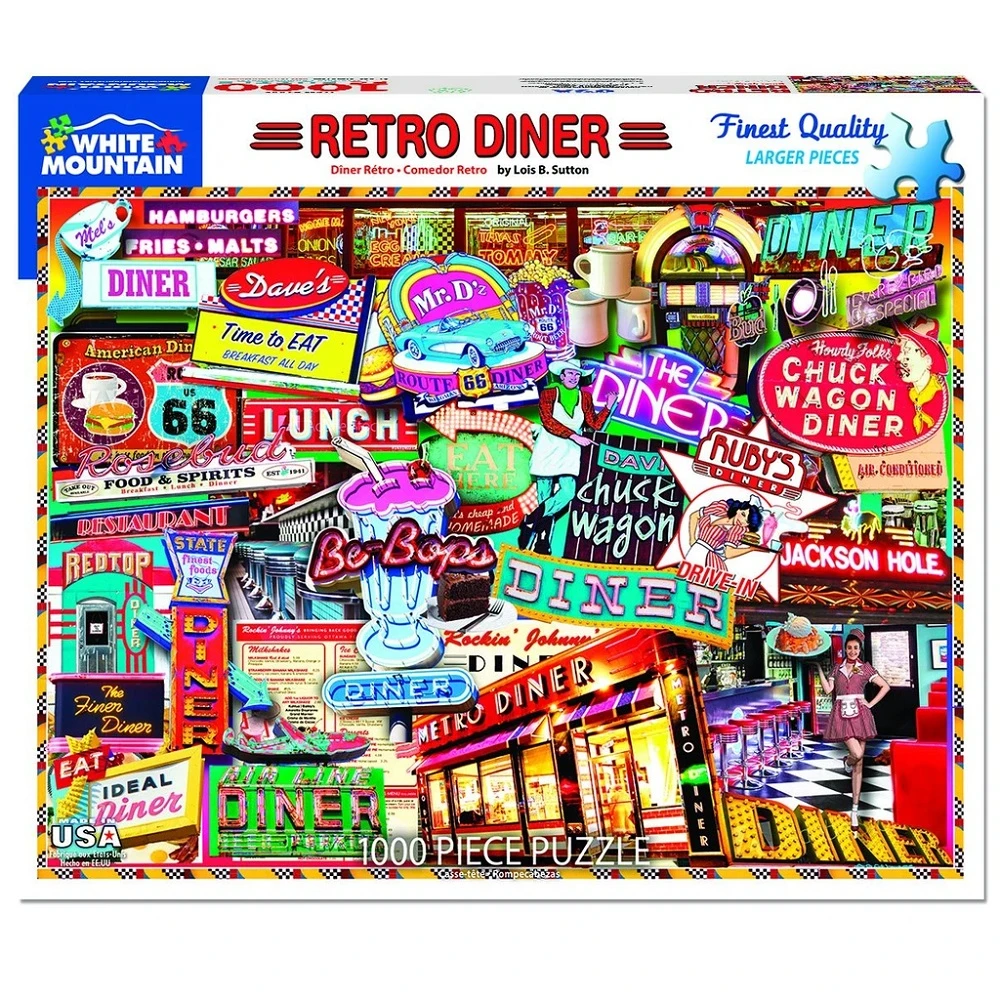 There’s nothing finer than a diner, and our Retro Diner 1000 piece puzzle is the finest! Designer Lois B. Sutton has selected some great ones for us to visit. Love the black and white tiles, chrome swivel stools and the classic Juke Box, ready and waiting for you to order a malt and a burger. Heaven in a 1,000 piece puzzle.
