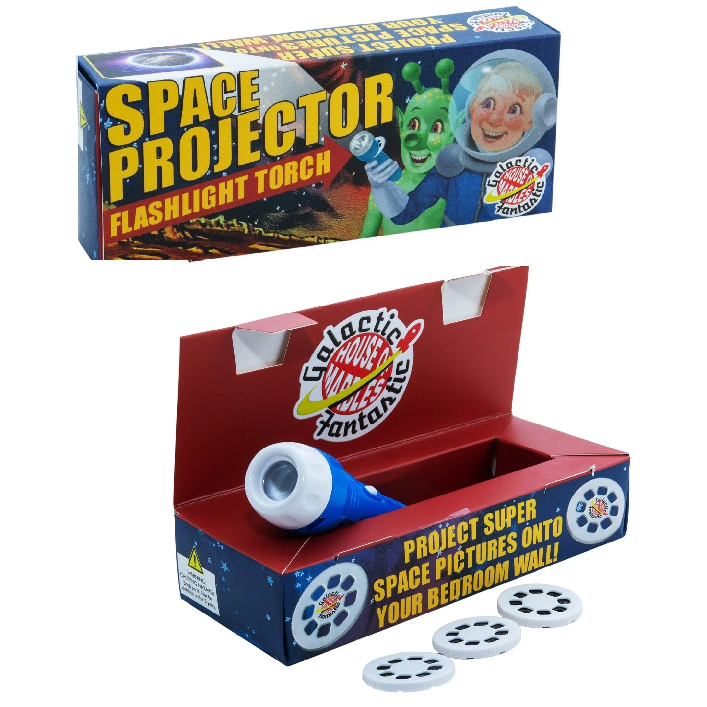 Travel to outer space from the comfort of your bed. Project super space pictures onto your bedroom wall with our space projector flashlight. Contains 24 space-themed images including planets, astronauts and rockets to project. Batteries included.