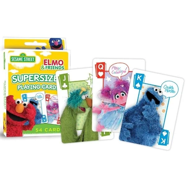 Sesame Street Elmo & Friends Supersized Playing Cards are the perfect deck for friends and families to share in on the fun. Each standard deck contains 52 cards and 2 jokers. The bright and playful cards feature Elmo and his furry, silly, loveable friends. The deck also includes instructions for games like Go-Fish, Crazy-Eights, War, and more. Enjoy your favorite Sesame Street episodes, then keep the fun going with this classic style card game! For 2-4 players, ages 4+