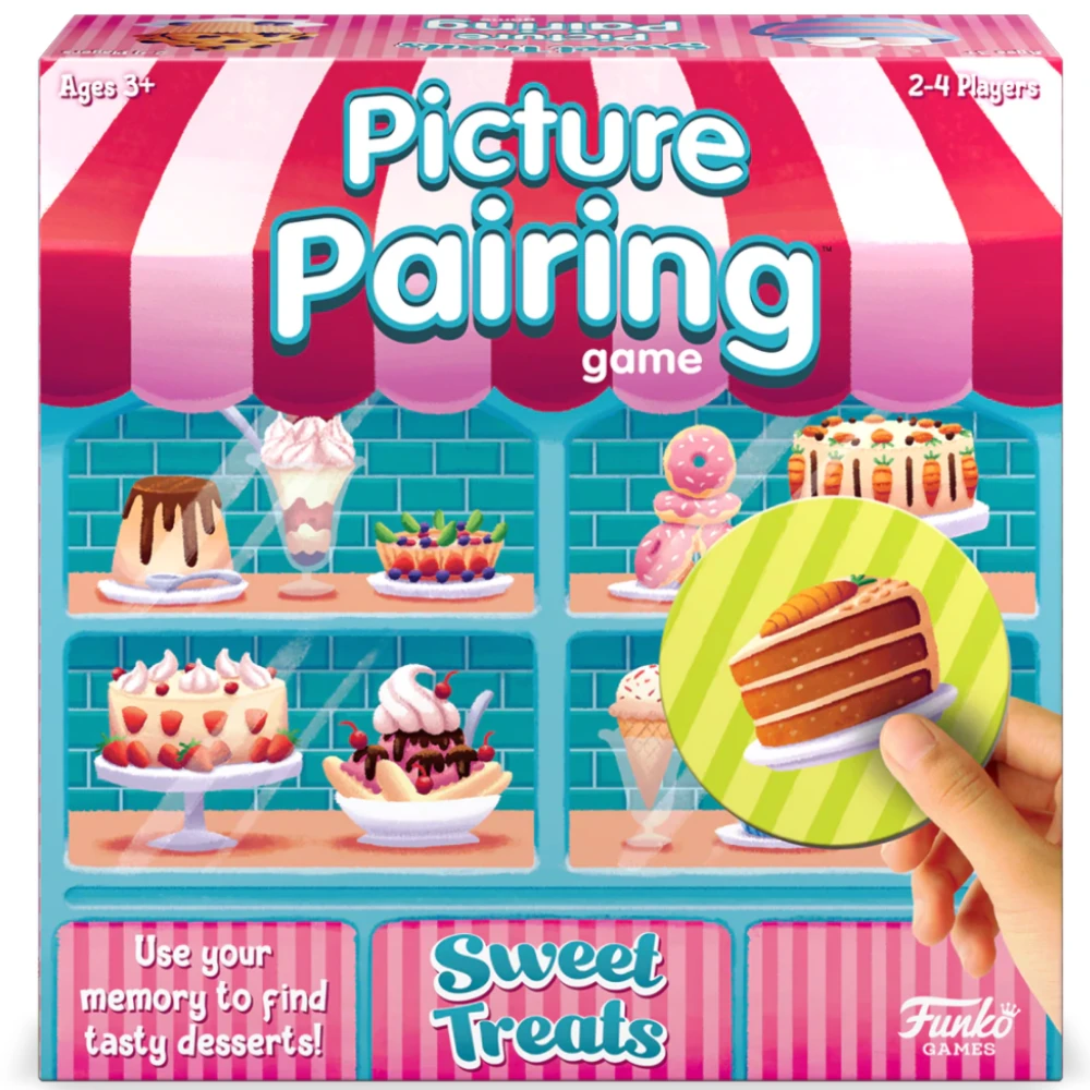 Find your favourite tasty desserts with the Sweet Treats Picture Pairing Game by Funko! Use your memory and search for sweet treats that match the pictures on the cards. You’ll have to move quickly… If you draw a Mix Up card, all the desserts must be reshuffled! Players take turns studying the Dessert Case, flipping two tiles over. If a tile matches a card, it’s scored, and the card is replaced. Unscored tiles are placed facedown again. When all the desserts are found, the player who scored the most tiles wins!
