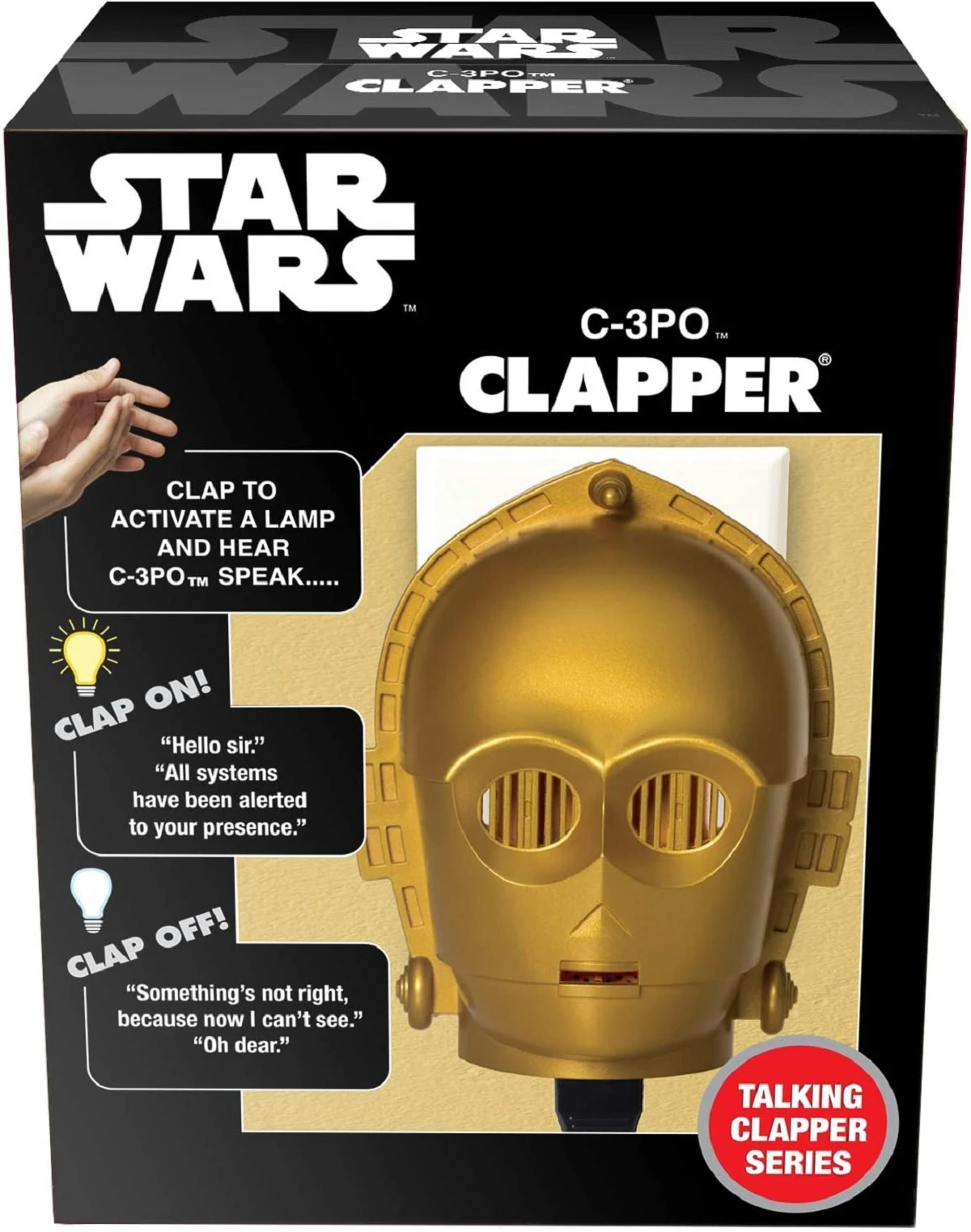 Use the force to turn on your lights and appliances. The C-3PO Talking Clapper is a fun and easy way to turn on the lights and other frequently-used appliances in your galaxy with a simple clapping of your hands.