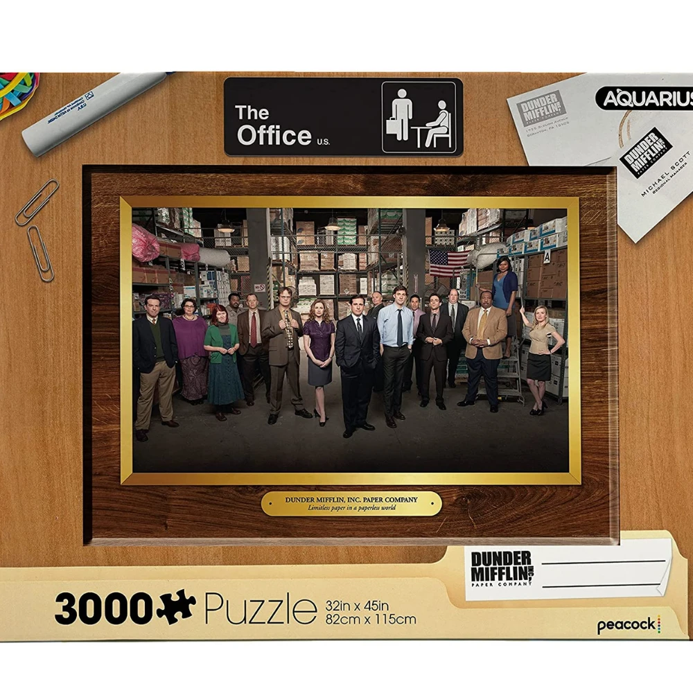 Fans of The Office TV show will love this 3000 pc puzzle featuring all the crew from the beloved Dunder Mifflin Paper Company. The Office puzzle shows a photo the season 4 cast in the warehouse, with a plaque that reads “Dunder Mifflin inc. Paper Company. Limitless paper in a paperless world”. This puzzle measures at a whopping 32 x 45 inches when completed.