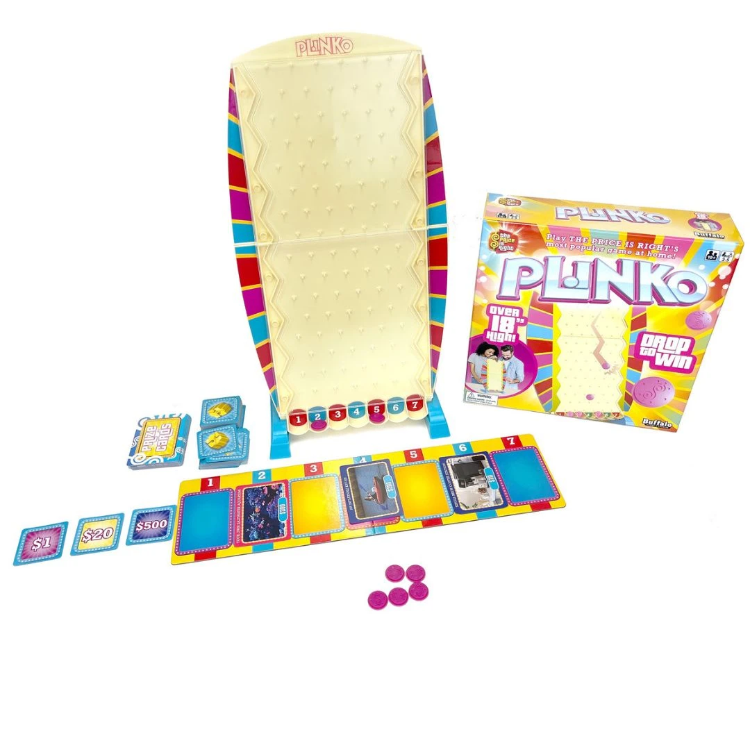Play The Price Is Right’s most popular board game at home! Come on down and compete with other contestants in the game you always dreamed of playing. Earn Plinko chips by playing Hi Lo. Then take turns stepping up to the official Plinko board and dropping your chips to score. Where will your chip land? The player who wins the most valuable prizes, wins the game! The board stands 18” tall and includes 7 Plinko Chips, 1 Gameboard, 37 Luxury Prize Cards and 100 Money cards.