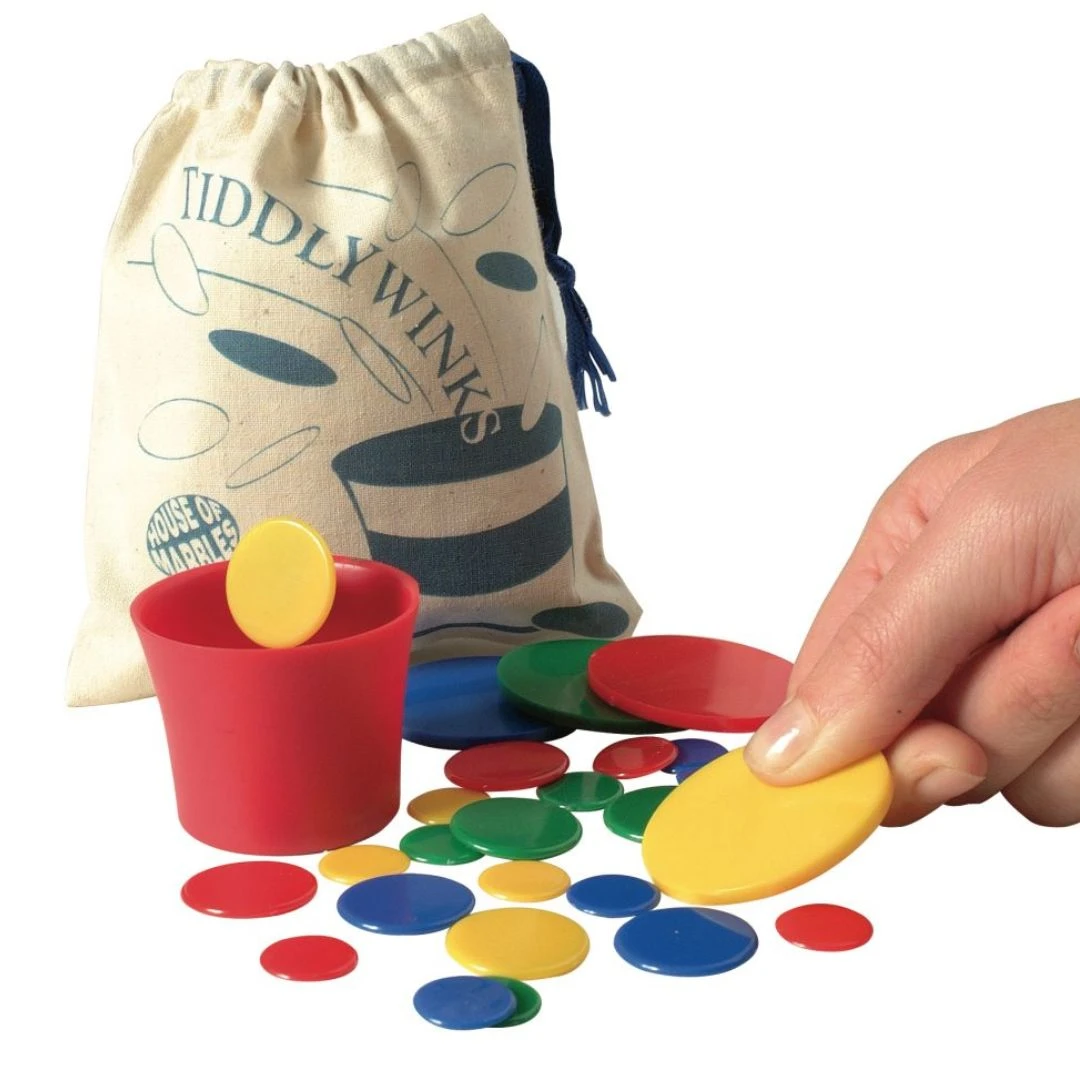 - Includes: Cup, Winks, Squidgers, Cloth Bag for storage, and Full Instructions from the English TiddlyWinks Association