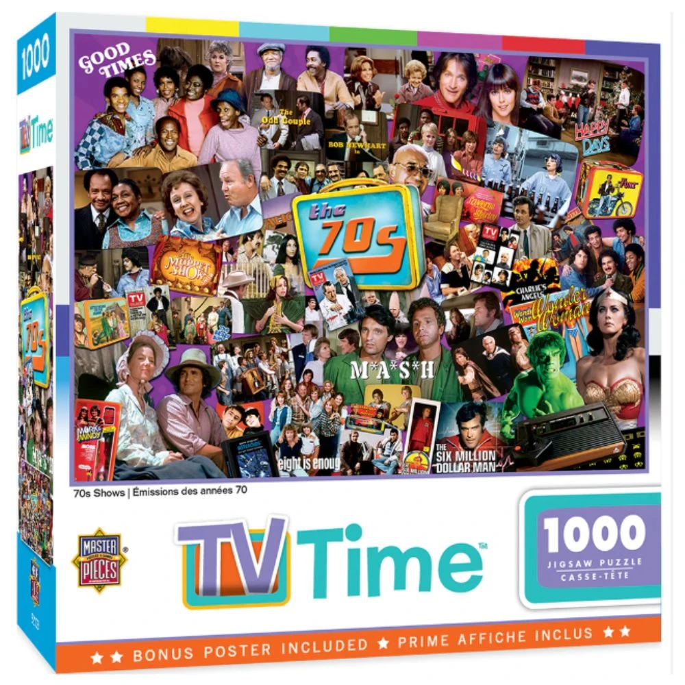 This MasterPieces 19.25″ x 26.75″ 1000pc TV Time Puzzle has a nostalgic feeling. Those 70s Shows from classic TV times past. These timeless puzzles are a throw-back to yester-year. The chipboard used in these puzzles is made of recycled material.