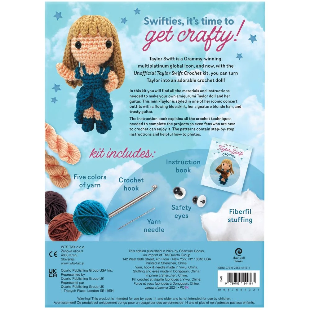 The Unofficial Taylor Swift Crochet Kit by Katalin Galusz is a comprehensive kit that allows you to create your own amigurumi (crocheted figure) of the popular singer-songwriter Taylor Swift. The kit includes all the necessary materials and instructions to make a cute and detailed Taylor Swift doll.