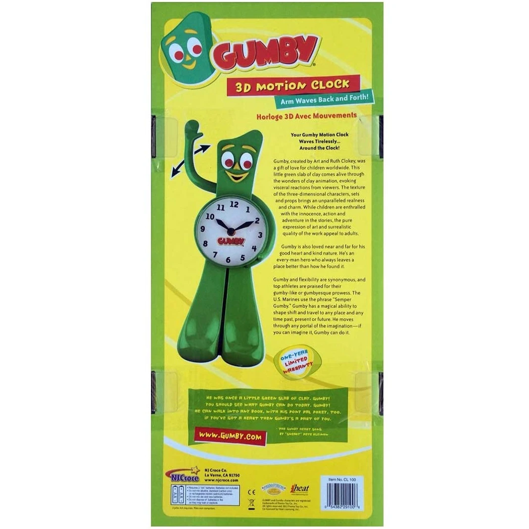 Your favourite classic character Gumby is now your favourite clock! A functional, nostalgic keepsake designed to keep time and keep you smiling. Gumby’s arm will wave back and forth and can stand on a level surface or be wall mounted.