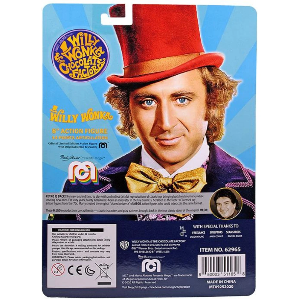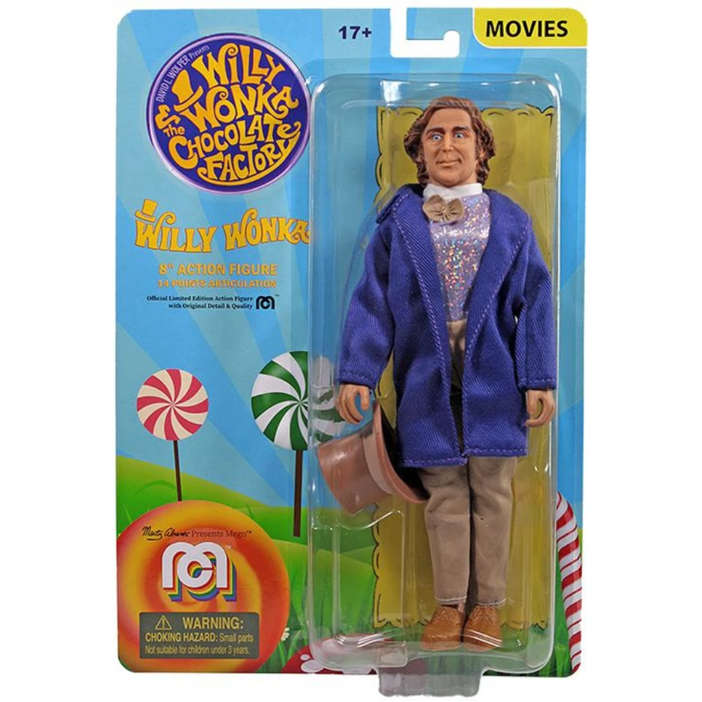 Enter a world of pure imagination with the 8-inch Willy Wonka action figure by Mego. This high quality scrumdiddlyumptious figure, inspired by Gene Wilder’s iconic character from the 1971 film Willy Wonka & the Chocolate Factory, features real fabric clothing, a removable top hat, and 14 points of articulation.